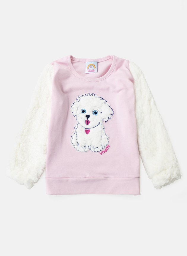 Destacando-se pelas mangas longas peluciadas em branco, proporciona um toque extra de calor e aconchego, ideal para os dias mais frescos. O charme está na estampa bordada de um adorável cachorrinho e na inscrição "Vitalite", detalhes que adicionam um toque lúdico e divertido ao visual. Para completar, possui uma barra em meia malha que proporciona um ajuste suave e seguro.