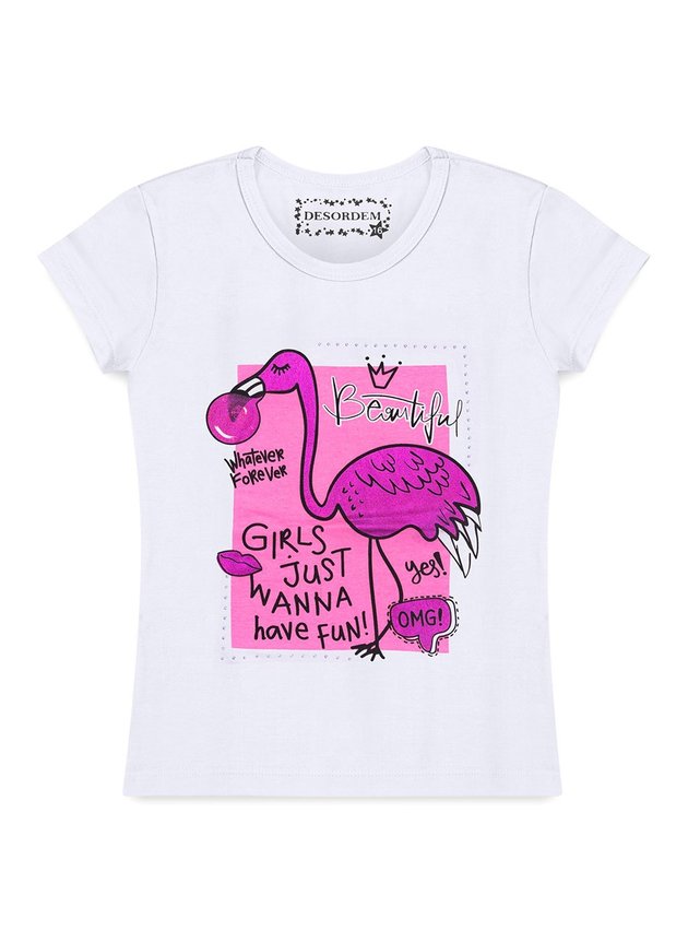 Blusa confeccionada em viscose com elastano, gola redonda, estampa frontal com glitter e aplique em tachas.