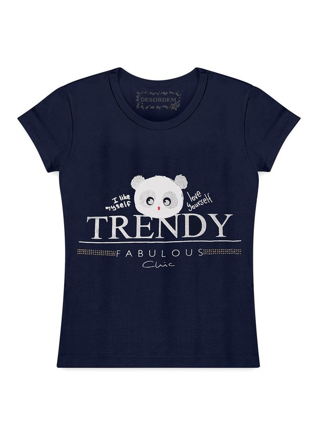 Blusa confeccionada em viscose com elastano, gola redonda, estampa frontal com glitter e aplique em tachas.
