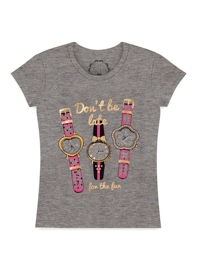Blusa confeccionada em viscose com elastano, gola redonda, estampa frontal com glitter e aplique em tachas.