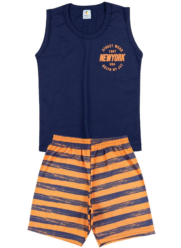 Conjunto infantil masculino composto por duas peças. 1 Camiseta estilo regata confeccionada em algodão, gola redonda e estampa frontal. 1 Bermuda confeccionada em moletinho estampado e cós com elástico.