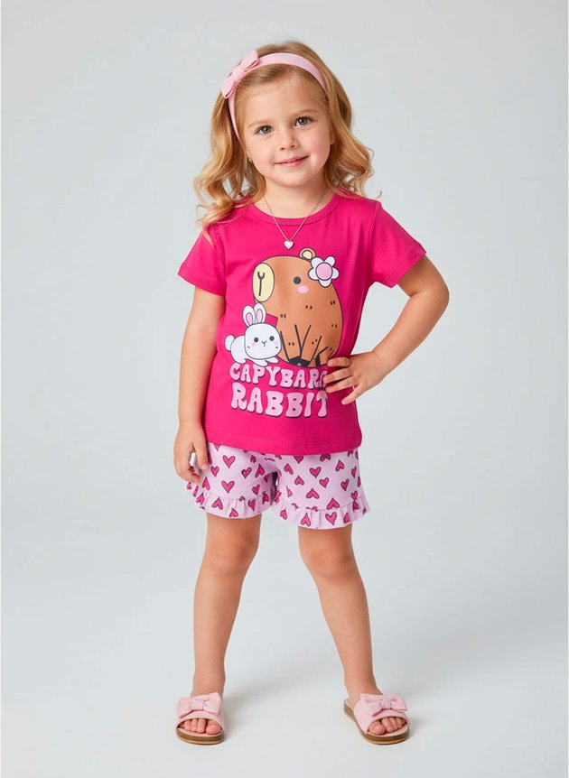 Perfeito para passeios, escola e momentos de lazer, o Conjunto Capybara Rabbit combina praticidade, conforto e um visual doce, que as meninas vão amar.