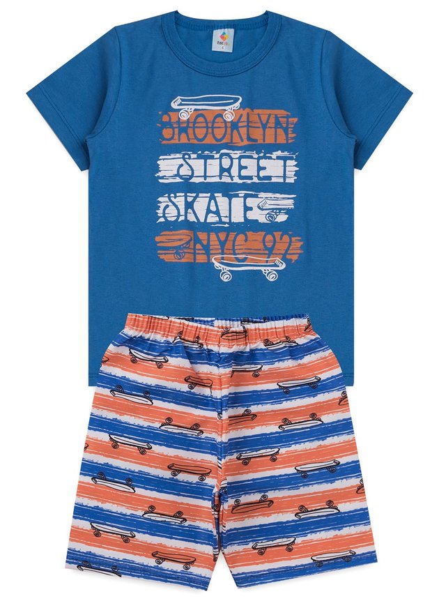 Conjunto infantil menino composto por duas peças. 1 Camiseta confeccionada em algodão, gola redonda e estampa frontal. 1 Shorts confeccionado em tactel estampado e cós com elástico.
