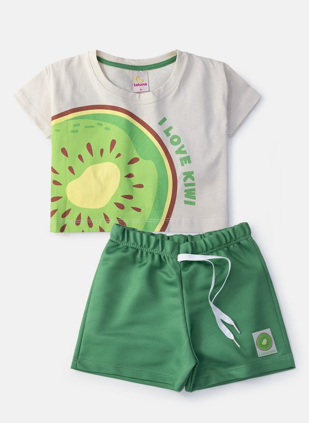 Cheio de frescor e estilo, o Conjunto Infantil Feminino "I Love Kiwi" é perfeito para as pequenas que adoram um look divertido e moderno!