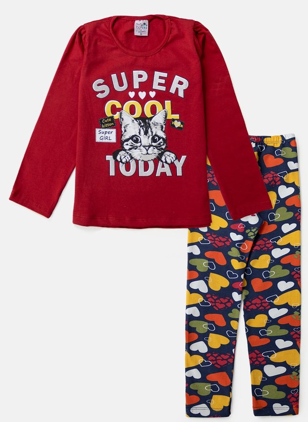 A calça, também feita em algodão e elastano, na suave cor marinho, garante conforto com seu cós elástico rebatido, ajustando-se perfeitamente à cintura da criança. O seu diferencial está na estampa corrida de corações em cores variadas, que traz um ar lúdico e repleto de amor ao conjunto.