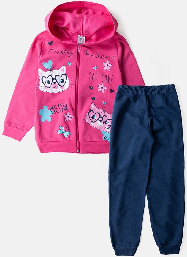 O casaco é confeccionado em moletom peluciado de alta qualidade na vibrante cor pink, proporcionando um toque suave e aconchegante. Com mangas longas, zíper frontal para fácil fechamento e capuz acolhedor, este casaco é tanto prático quanto confortável. A estampa encantadora apresenta dois rostinhos de gatinhas sorridentes com óculos, acompanhadas das frases "Pretty Kittens", "Cat Love" e "Meow". Adicionalmente, a estampa é adornada com corações, flores e detalhes em glitter, que adicionam um toque de brilho e magia ao visual.