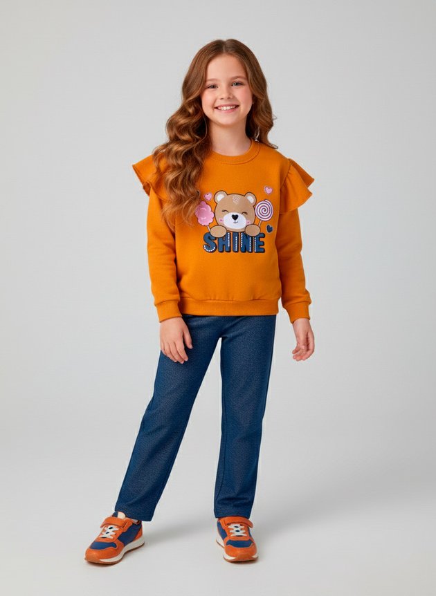 O casaco é confeccionado em moletom peluciado laranja, perfeito para os dias mais fresquinhos. Possui mangas longas com detalhe em outra manga curta sobreposta e franzida nos ombros, que adicionam um toque moderno e charmoso ao look. Os punhos e a barra em ribana garantem ajuste confortável. O destaque fica por conta da estampa frontal de um ursinho com glitter, acompanhada da palavra "Shine", que traz brilho e doçura à peça.