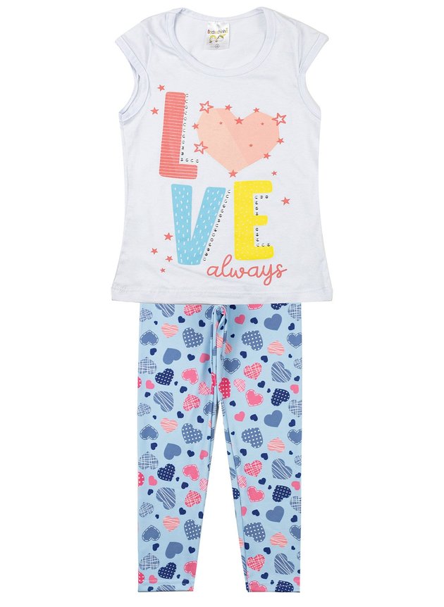 Conjunto composto por duas peças. 1 Blusa confeccionada em algodão (100%), gola redonda, estampa frontal com aplique em tachas. 1 Legging confeccionada em poliéster com elastano (92% poliéster e 2% elastano) estampado, cós com elástico.