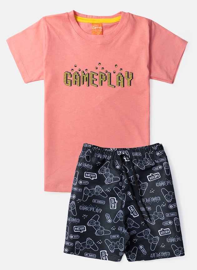 Prepare seu pequeno para horas de diversão com o nosso Conjunto Infantil Masculino! A camiseta, feita em algodão na vibrante cor coral, possui mangas curtas e um reforço de gola em amarelo que traz um toque de contraste alegre. A estampa "Gameplay" em letras divertidas destaca a paixão dos pequenos pelos jogos, tornando este visual ainda mais especial.