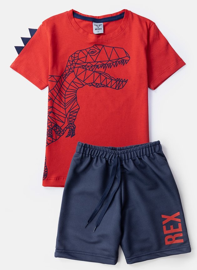 Este conjunto é a escolha perfeita para os pequenos aventureiros que desejam conforto e estilo durante a temporada de verão. A blusa de manga curta, confeccionada em algodão na cor vermelho, oferece uma sensação suave e fresca, ideal para os dias quentes. O reforço de gola contrastante na cor azul marinho adiciona um toque de estilo moderno. A estampa de um t-rex geométrico é criativa e diferenciada, e o diferencial é o aplique interativo na manga, que dará aos pequenos algo para explorar e se divertir.