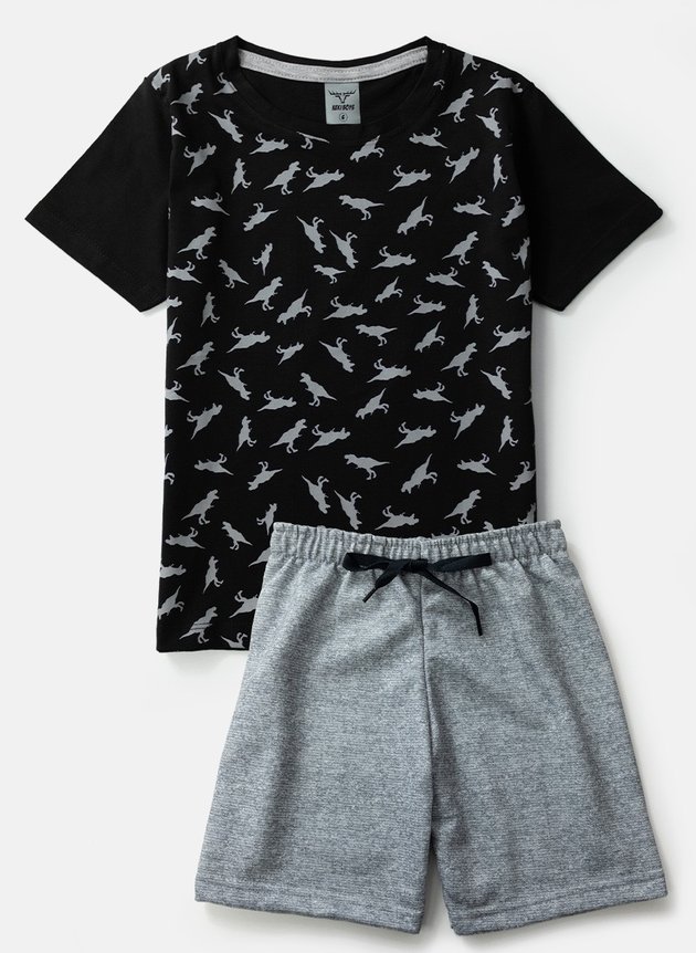 Conjunto Infantil Masculino Mini Dinos Preto, uma escolha estilosa e confortável para os pequenos aventureiros que estão prontos para explorar o verão com muita personalidade!