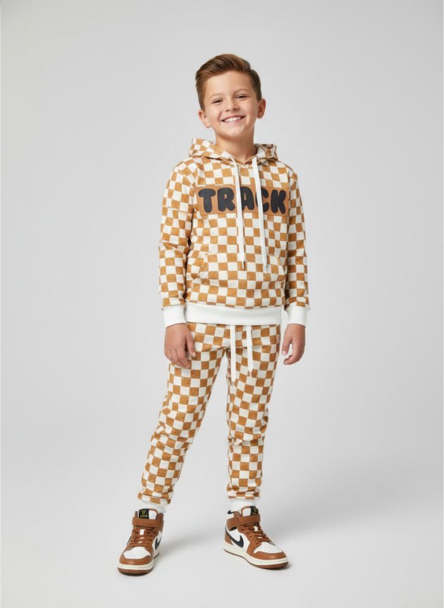O casaco é uma peça versátil e cheia de personalidade. Com mangas longas para manter os braços aquecidos, possui um capuz para proteger do vento e do frio. Os punhos e a barra em ribana proporcionam um ajuste confortável e seguro, enquanto a estampa corrida quadriculada em creme e ocre adiciona um toque de modernidade ao visual. Destaque-se também para a estampa com a palavra "Track" em branco, trazendo um ar urbano e descontraído.