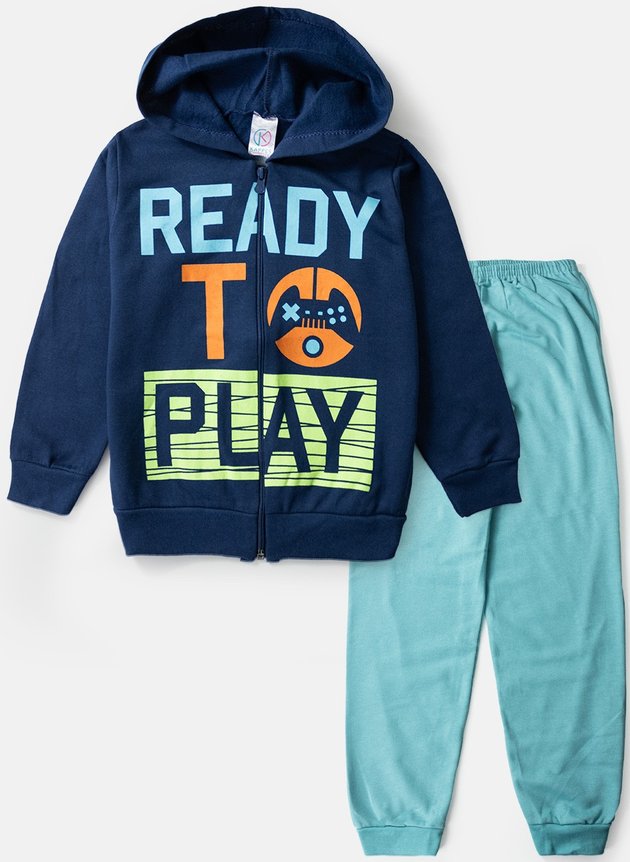 O casaco é confeccionado em moletom peluciado de alta qualidade na cor marinho, garantindo suavidade e aconchego para a pele delicada das crianças. Com mangas longas, zíper frontal e um capuz aconchegante, este casaco é ideal para manter os meninos aquecidos e confortáveis. A estampa moderna traz a frase "Ready To Play", com um joystick como detalhe na letra "o", adicionando um toque lúdico e estiloso ao visual.