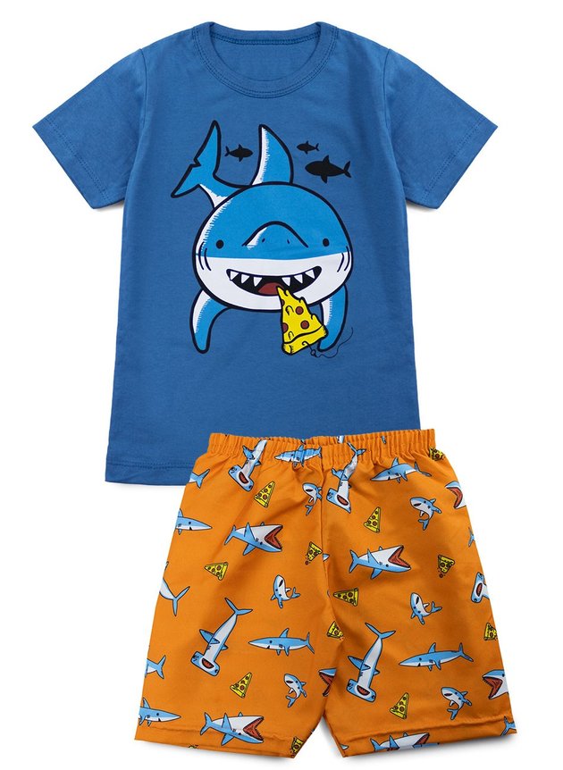 Conjunto infantil menino composto por duas peças. 1 Camiseta na cor azul confeccionada em algodão, gola redonda e estampa frontal. 1 Shorts confeccionado em tactel estampado e cós com elástico.