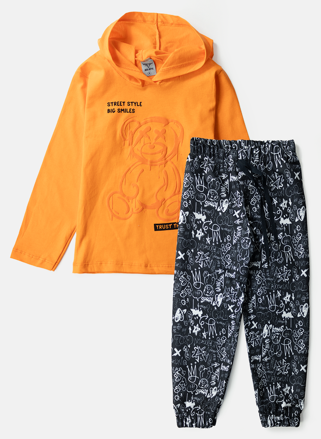 Apresentamos o Conjunto Infantil Meia Estação Mangas Longas, uma combinação perfeita de estilo e conforto para os pequenos que adoram se destacar com personalidade. A blusa, confeccionada em algodão na vibrante cor laranja, é uma explosão de alegria. Com mangas longas e um capuz que adiciona um toque descolado, esta peça é a escolha certa para os dias mais frescos.