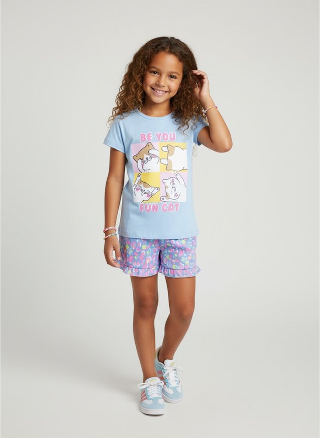 O Conjunto Infantil Menina "Be You Fun Cat" combina conforto e modernidade para o dia a dia das pequenas.