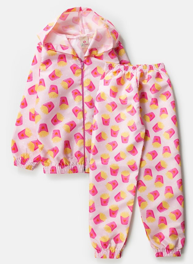 Destacando-se com uma estampa encantadora, apresenta diversas batatas fritas sobre um fundo rosa, adicionando um toque de alegria e vitalidade ao visual. Combinando perfeitamente, a calça também é confeccionada em tactel corta vento 100% poliéster na mesma tonalidade rosa. Seus punhos e cós com elástico rebatido garantem um ajuste seguro, enquanto a estampa coordenada com a jaqueta completa o conjunto de forma harmoniosa.