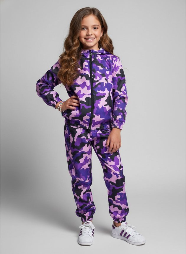 O Conjunto Infantil Menina Corta Vento "Camuflado" combina estilo, proteção e conforto, sendo perfeito para dias mais frescos ou ventosos.