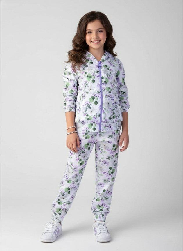 A calça, também confeccionada em tactel corta vento, acompanha o conjunto com cós e punhos com elástico rebatido, proporcionando liberdade de movimento. A estampa florida, igual à da jaqueta, completa o look harmoniosamente.