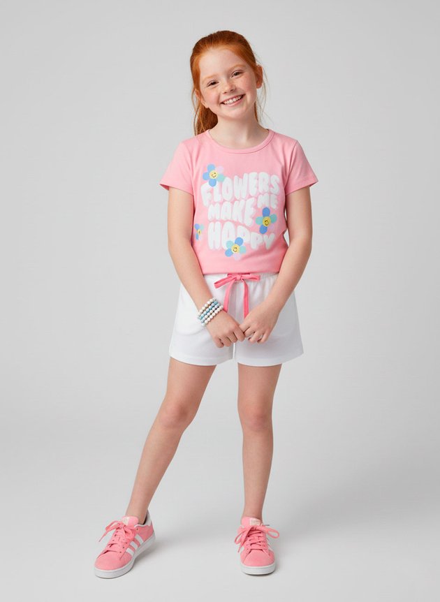 O shorts é confeccionado em moletinho liso na cor creme, garantindo maciez e praticidade. Conta com cós em elástico rebatido, que oferece ajuste seguro e confortável, além de um cadarço aplicado na cor rosa, que harmoniza com a camiseta e adiciona um toque delicado ao visual.