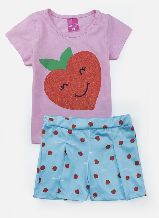 A blusa, confeccionada em algodão macio na cor rosa, possui mangas curtas que garantem conforto e frescor para os dias mais quentes. O destaque fica por conta da estampa divertida de uma maçã estilosa, com detalhes em glitter, que trazem brilho e um toque lúdico ao visual, deixando a peça ainda mais encantadora.