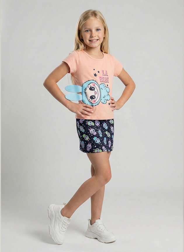 O shorts saia é produzido em suplex de alta qualidade, oferecendo conforto e liberdade para brincar à vontade. O cós com elástico aplicado garante ajuste perfeito ao corpo, enquanto a estampa rotativa de bonequinhos sobre o fundo preto completa o visual com estilo, delicadeza e muita modernidade.