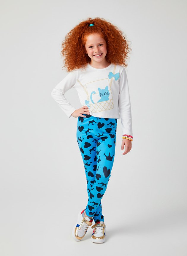 A calça, confeccionada em suplex, é confortável e leve, com cós de elástico rebatido que garante melhor ajuste. Possui uma estampa corrida de corações e coroas sobre um fundo azul, trazendo um toque lúdico e cheio de personalidade à composição.