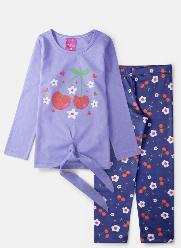 A blusa é confeccionada em algodão na cor lilás, com mangas longas e faixas para amarração frontal, que adicionam um toque fashion à peça. Sua estampa frontal traz duas cerejinhas, flores e corações, tudo isso com detalhes em glitter que brilham e encantam, deixando o look ainda mais especial.