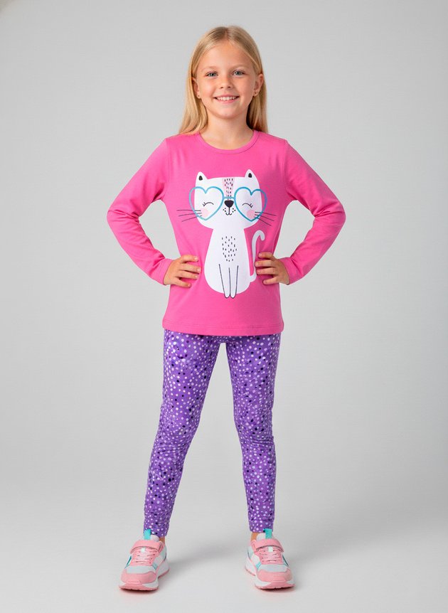 A blusa, confeccionada em algodão na cor pink, conta com mangas longas e uma estampa frontal encantadora de uma gatinha estilosa usando óculos, com detalhes em glitter que trazem um toque especial de brilho e diversão ao look.