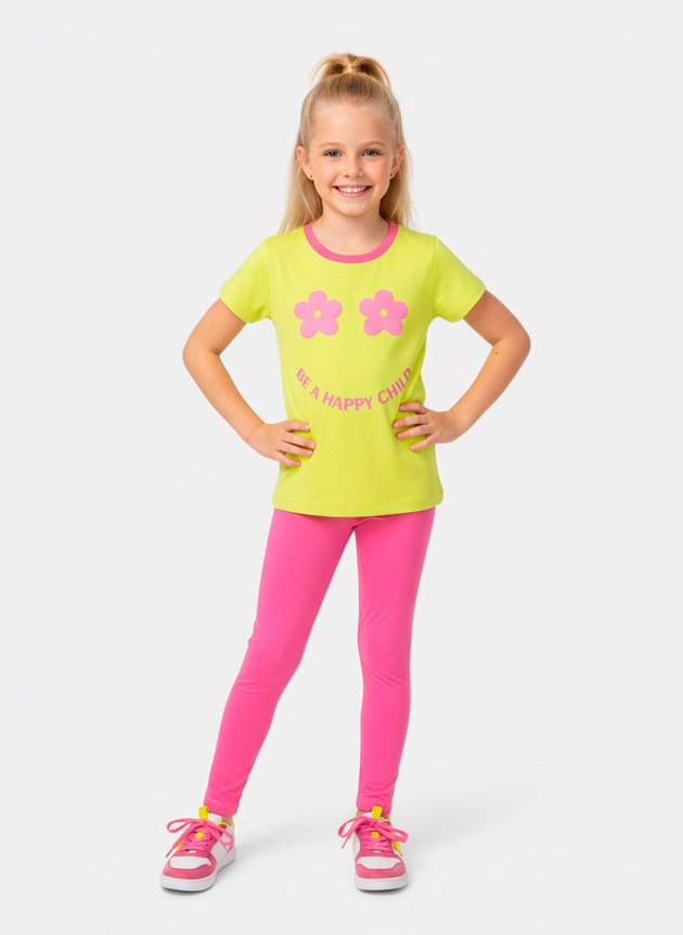 A camiseta, confeccionada em algodão na vibrante cor amarelo lima, possui mangas curtas e gola em contraste pink, que adiciona um toque divertido ao visual. A estampa frontal traz duas flores delicadas com efeito puff e a frase inspiradora "Be A Happy Child", incentivando leveza e felicidade no dia a dia das pequenas.