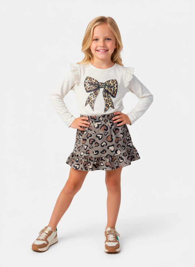 A saia, confeccionada em suplex, traz cós com elástico rebatido para melhor ajuste e barra franzida, garantindo um caimento soltinho e cheio de charme. A estampa animal print sobre fundo marrom complementa o look com um toque moderno e ousado.