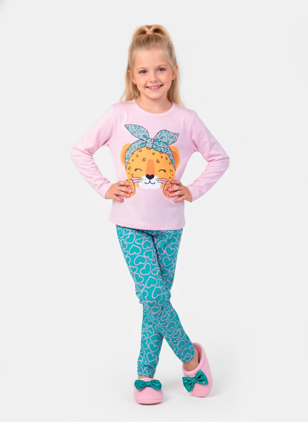 A blusa, confeccionada em algodão na suave cor rosa bebê, traz mangas longas e uma encantadora estampa frontal de uma oncinha usando um lacinho na cabeça, com detalhes em glitter que adicionam um toque de brilho especial.