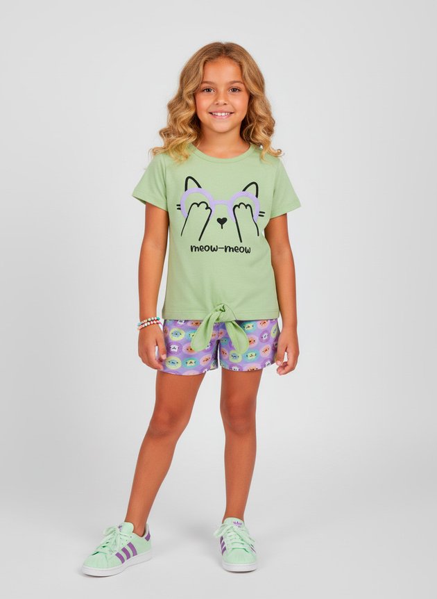 A blusa, confeccionada em 100% algodão na cor verde, possui mangas curtas com uma estampa de um gato usando óculos que é uma estampa puff lilás, tampando os olhinhos. Acompanhada da frase Meow Meow. O detalhe das faixas para amarração na cintura trás um toque moderno e delicado ao visual.