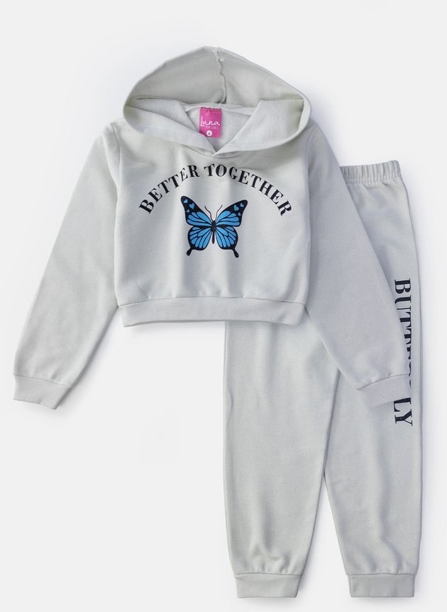A calça, também em moletom peluciado cinza, possui cós com elástico rebatido, punhos em ribana e um cadarço aplicado na cor azul, garantindo um ajuste confortável e estiloso. O detalhe especial fica por conta da estampa lateral na perna esquerda com a escrita "Butterfly" em preto, trazendo ainda mais personalidade ao look.