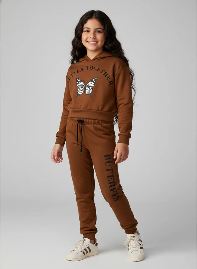 A calça, também em moletom peluciado marrom, possui cós com elástico rebatido, punhos em ribana e um cadarço aplicado na cor preto, garantindo um ajuste confortável e estiloso. O detalhe especial fica por conta da estampa lateral na perna esquerda com a escrita "Butterfly" em preto, trazendo ainda mais personalidade ao look.