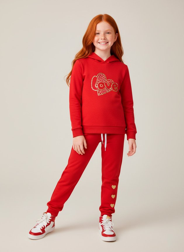 A calça, também em moletom peluciado vermelho, garante máximo conforto e liberdade para brincar. Seu cós com elástico rebatido permite um ajuste perfeito, enquanto o cadarço branco com detalhes em prata adiciona um toque sofisticado. Para completar, apliques em termocolante em formato de coração na perna esquerda trazem ainda mais delicadeza ao conjunto.