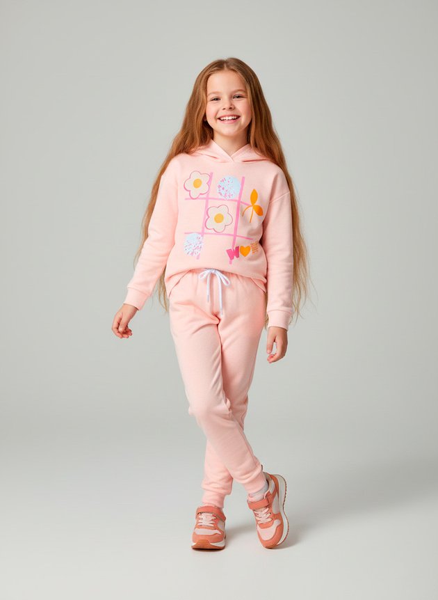 A calça, também em moletom peluciado pêssego, é projetada para conforto térmico e liberdade de movimento. Seu cós com elástico rebatido garante um ajuste seguro e confortável, enquanto um cadarço aplicado acrescenta um detalhe de estilo.