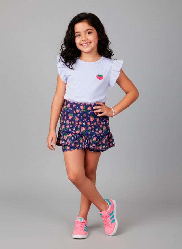 Composição: Blusa 100% Algodão, Shorts Saia 100% Poliéster.