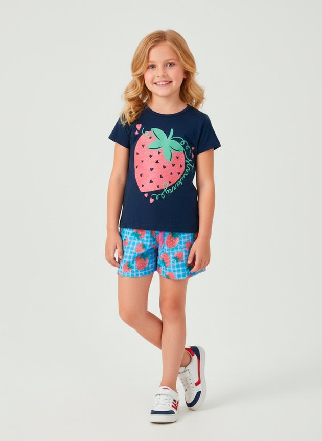O shorts, confeccionado em moletinho leve, possui cós com elástico rebatido e cadarço decorativo rosa, proporcionando conforto e ajuste ideal. A estampa de moranguinhos sobre fundo azul claro completa o look com um toque divertido e cheio de estilo.