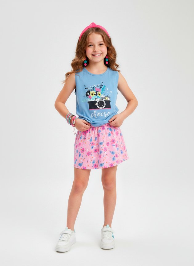 O Conjunto Infantil Menina Shorts Saia "Cheese" encante-se com o charme e a leveza deste conjunto infantil menina!