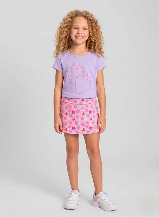 A blusa confeccionada em algodão lilás é leve e confortável, com mangas curtas e uma encantadora estampa com glitter, que destaca a frase "So Berry Cute" acompanhada de dois morangos, adicionando um toque divertido e delicado.