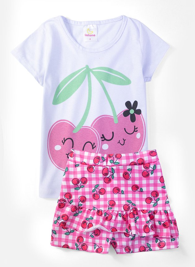 O shorts confeccionado em suplex garante liberdade de movimentos, conta com cós em elástico para ajuste seguro e confortável. Além do detalhe de babado franzido com uma estampa xadrez no tom rosa e branco com cerejinhas no fundo, que deixa o look ainda mais fofo e divertido.