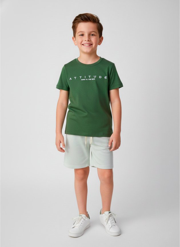 A camiseta 100% algodão na cor verde possui mangas curtas e uma estampa com as escritas “Attitude” e “Hope to the end”, garantindo um visual moderno e cheio de personalidade.