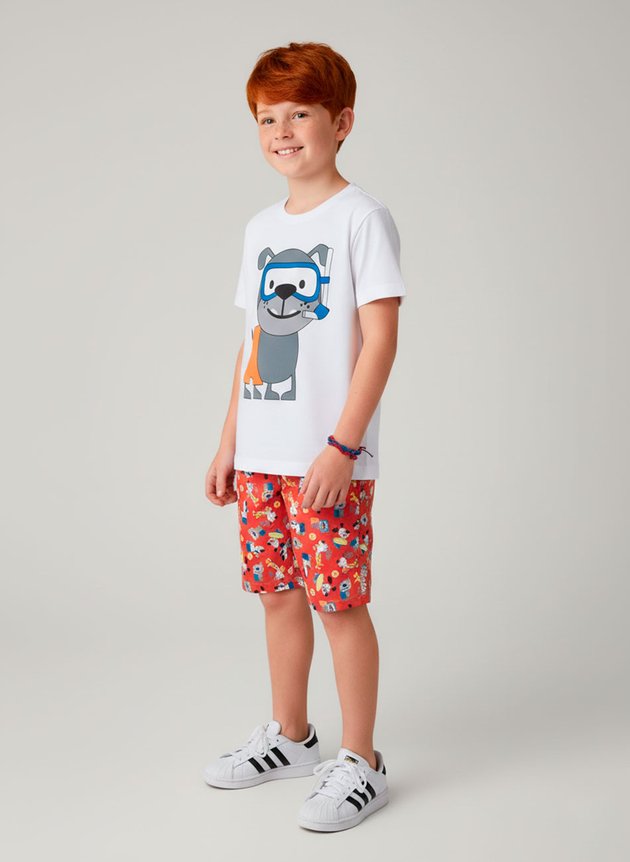 O shorts, confeccionado em tactel leve e prático, possui cós com elástico rebatido que garante ajuste confortável. A peça conta com uma estampa corrida cheia de personalidade, com diversos cachorrinhos sobre um vibrante fundo vermelho, completando o conjunto com muita alegria.