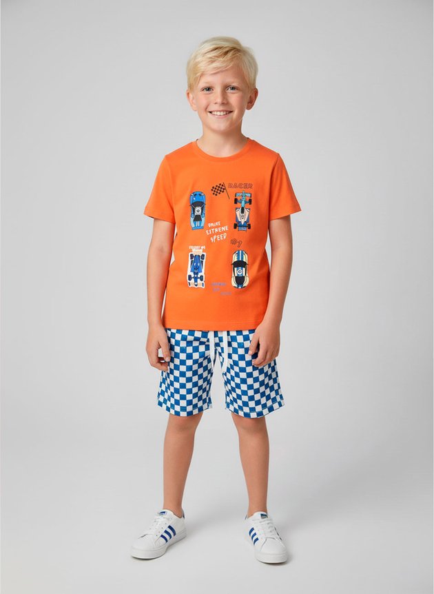 A camiseta é confeccionada em algodão, na cor laranja vibrante, com mangas curtas e reforço de gola em contraste azul, que garante resistência e um toque moderno. O grande destaque está na estampa frontal com carrinhos de corrida, sendo um deles interativo, além de diversas escritas que remetem ao universo automobilístico.