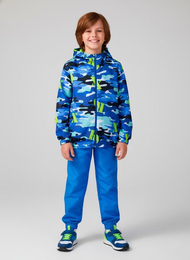 A Jaqueta é confeccionada em tactel corta vento, tecido leve, resistente e que protege contra o vento. Possui mangas longas, punhos e barra com elástico rebatido, que oferecem melhor ajuste ao corpo e mais segurança nos movimentos. Conta também com capuz forrado em meia malha na cor verde, trazendo um contraste moderno e divertido. O zíper frontal é funcional, facilitando na hora de vestir e despir. A estampa corrida em camuflado nos tons de azul, combinada com letras na cor verde, dá um toque despojado e super estiloso à peça.