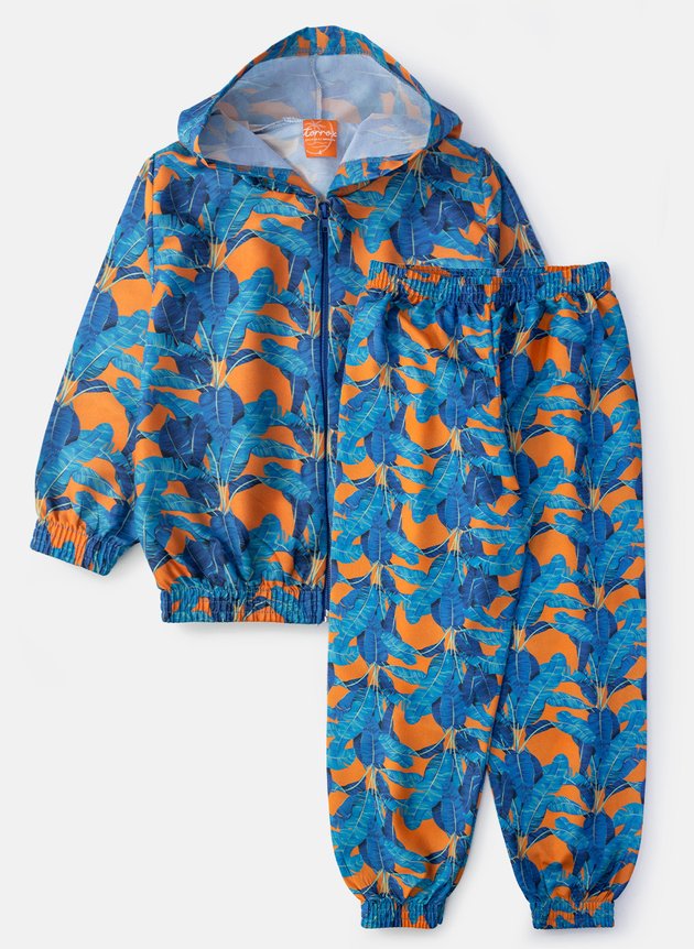 A calça, também confeccionada em tactel corta vento, acompanha a mesma estampa tropical, e possui cós e punhos com elástico rebatido, garantindo ajuste perfeito ao corpo e liberdade nos movimentos.