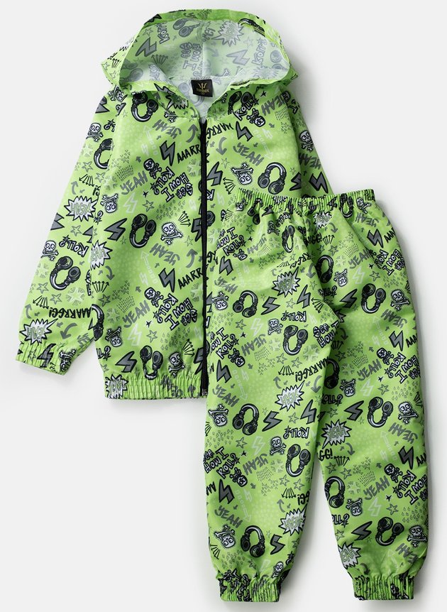 A jaqueta com capuz é confeccionada em tactel na cor verde, proporcionando resistência ao vento e à umidade. Sublimada com estampas variadas de raios, fones e setas, esta jaqueta adiciona um toque de dinamismo e energia ao visual dos meninos. Com mangas com punhos na barra, garante um ajuste confortável e proteção adicional contra o vento.