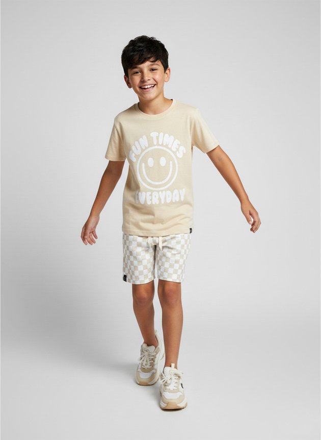 A camiseta, confeccionada em algodão na cor areia, possui reforço de gola para mais durabilidade e conforto, além de uma estampa frontal divertida com o rosto de um smile e a frase “Fun Times Everyday”.