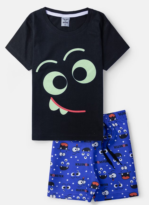 A blusa de manga curta, na cor preta, apresenta uma estampa encantadora de olhos de monstrinhos que brilham no escuro. Quando a luz se apaga, esses monstrinhos ganham vida, transformando a noite em um mundo mágico cheio de sorrisos e risos. O reforço de gola garante durabilidade, mesmo nas brincadeiras mais animadas.